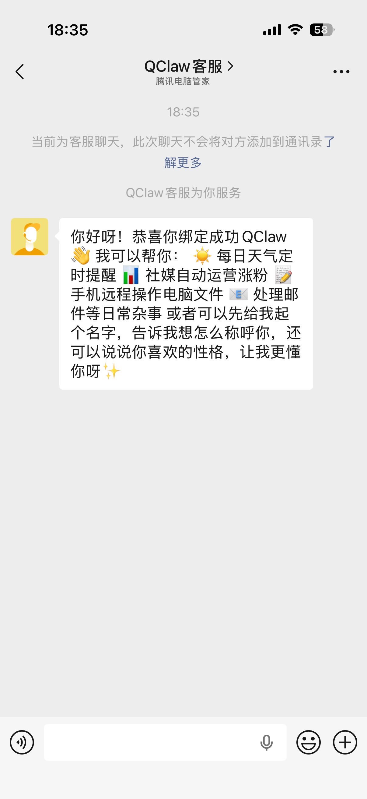 第三步:打开 QClaw 客户端,用微信扫描屏幕上的二维码,登录后,再次扫描完成绑定微信(支持登录、绑定不同的微信)。绑定后微信里【客服消息】会多一个“QClaw客服”。