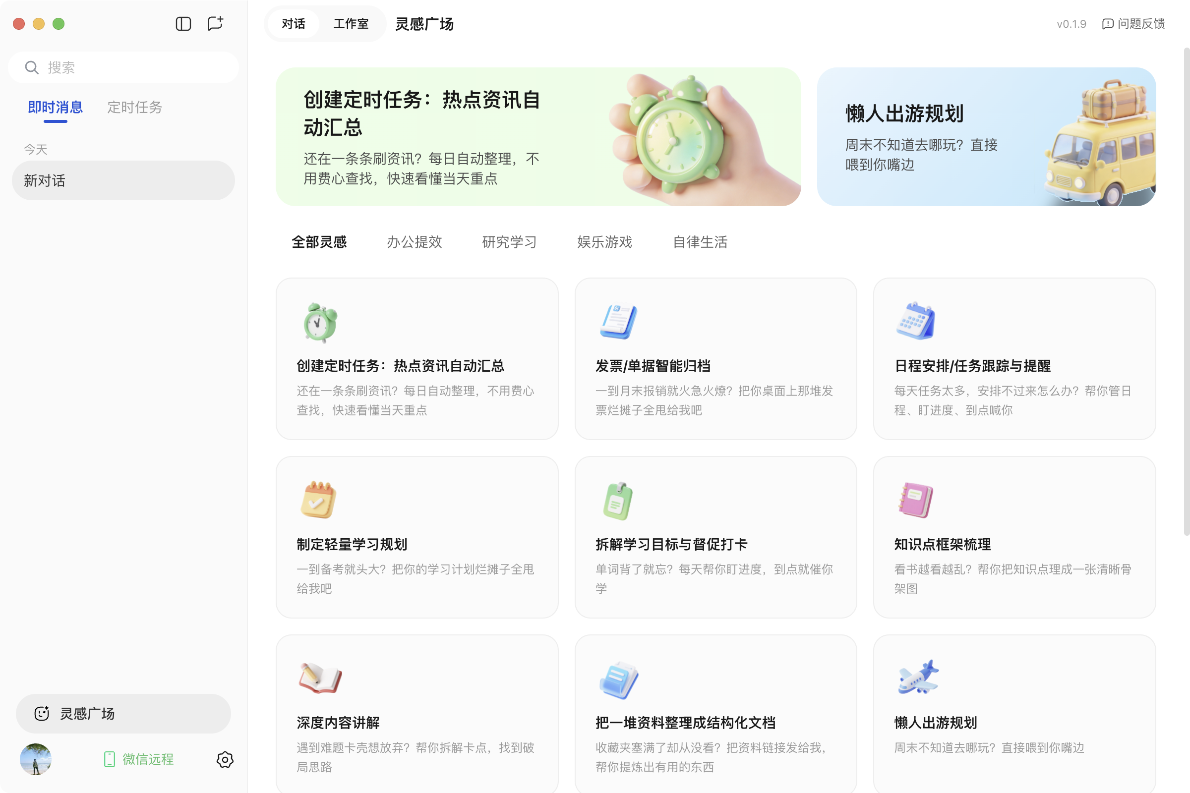 针对这一难题,QClaw上线“灵感广场”,围绕办公提效、深度研究、娱乐游戏、自律生活等典型场景,打造了近20个常用任务,可自动加载对应skills。用户无需配置或编写指令,点击「立即使用」就能运行Skills,让技术小白也能轻松“养虾”。