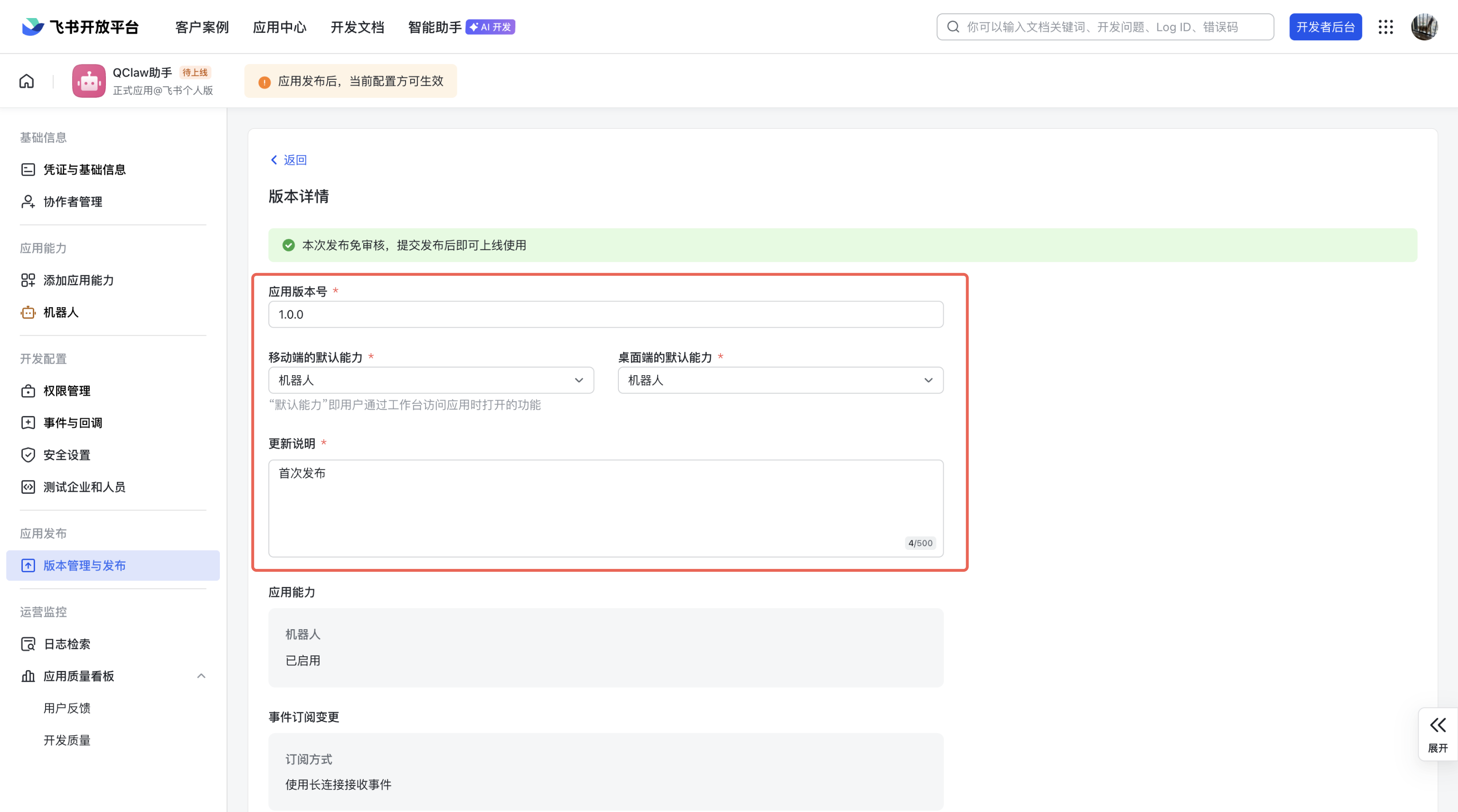 3、飞书应用创建版本