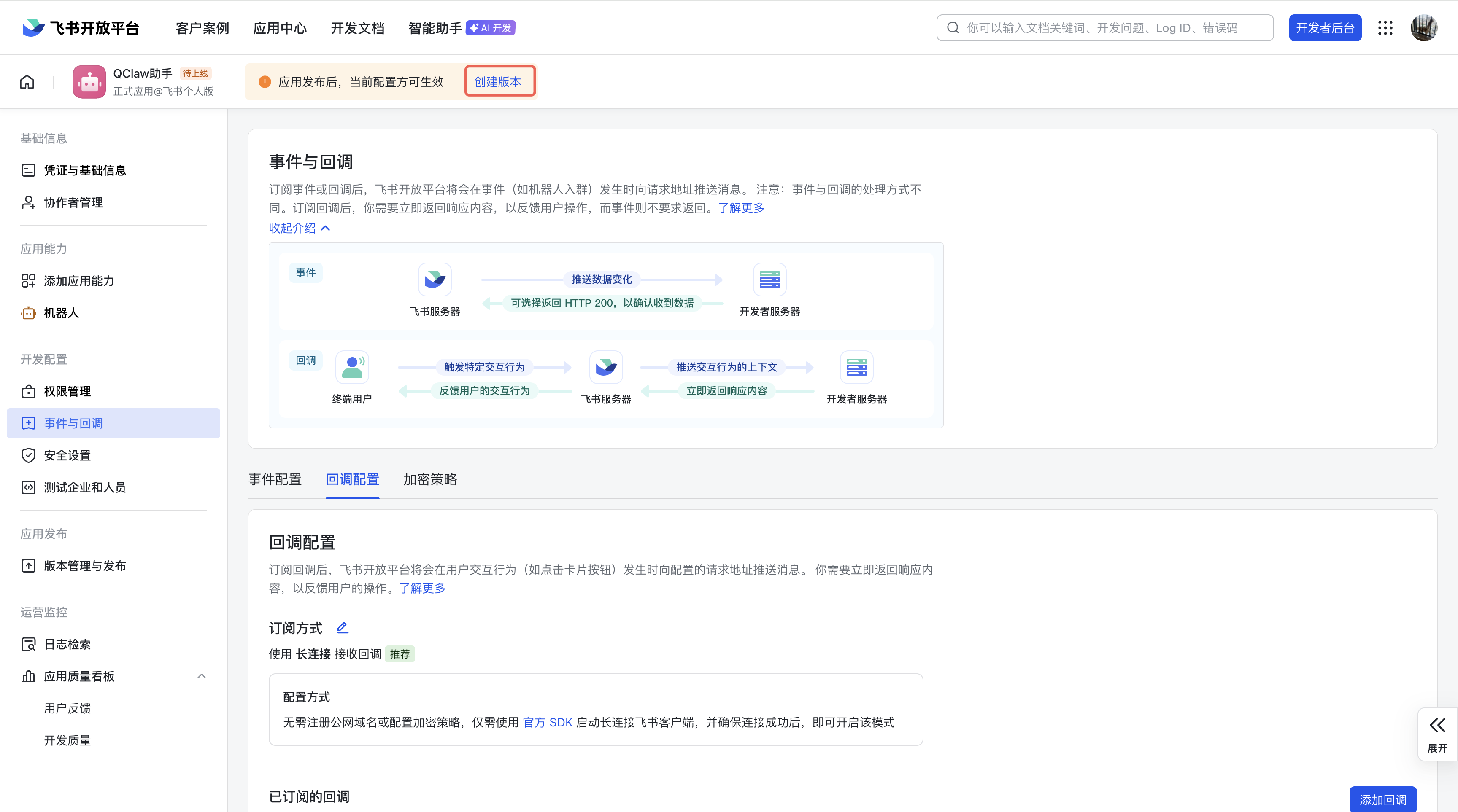 (4)切换到「回调配置」页签,选择订阅方式为「使用 长连接 接收事件」,再点击「保存」