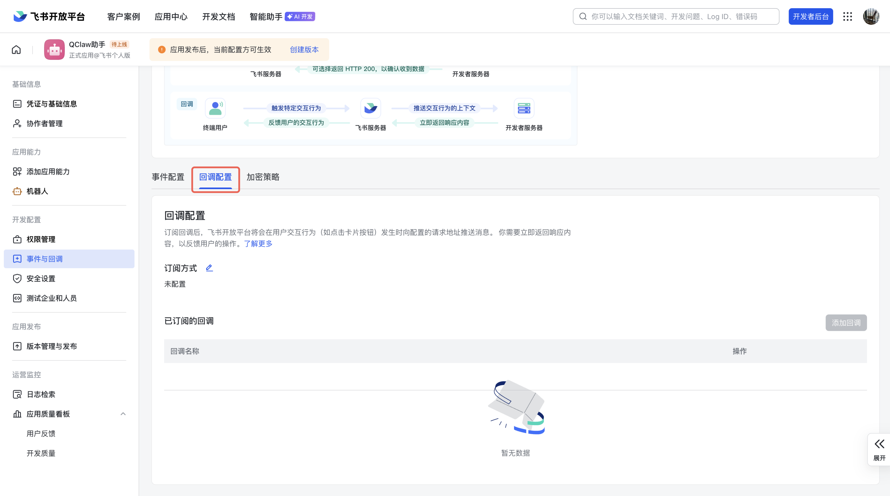 (5)在「回调配置」区域,点击「添加回调」,搜索「卡片回传交互」,点击「添加」,