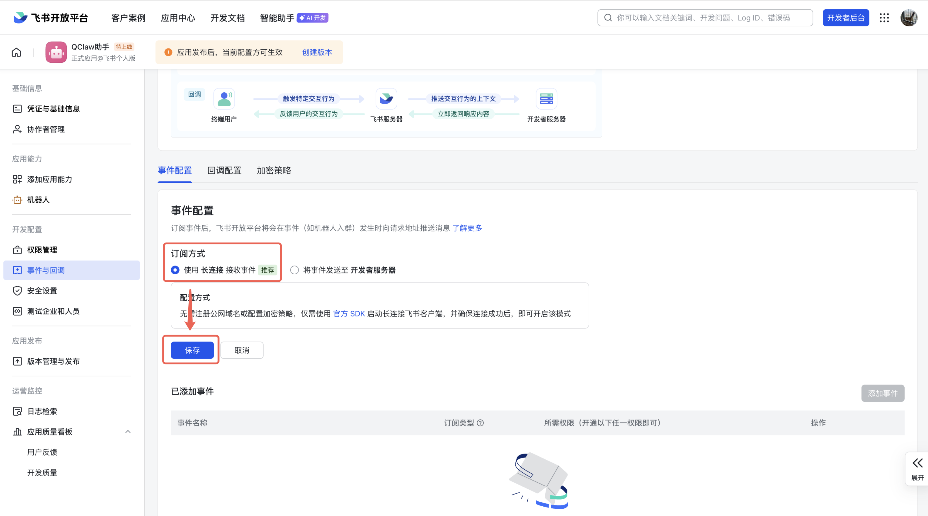 (2)选择订阅方式为「使用 长连接 接收事件」,再点击「保存」