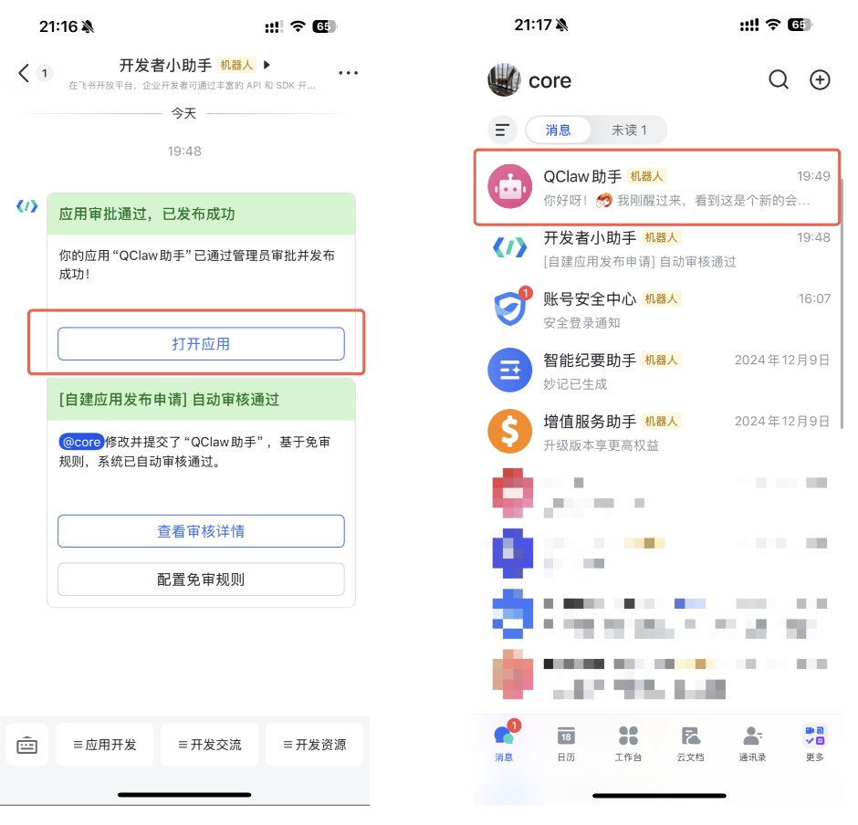 (1)飞书列表中「开发者小助手」会推送“应用审批通路,已发布成功”,点击「打开应用」开始使用。