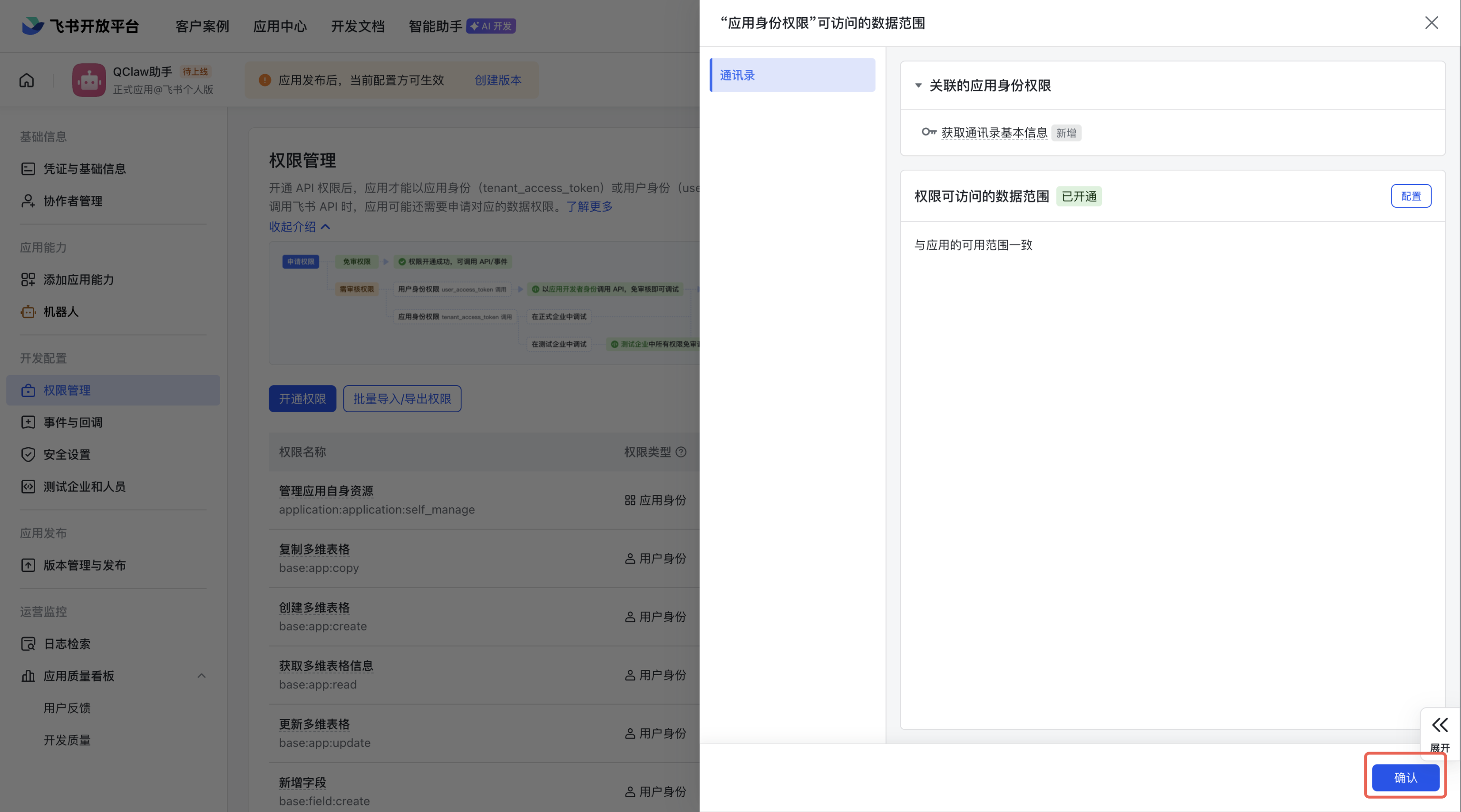 等待几秒钟,页面会显示权限已成功添加,点击右下角「确认」。