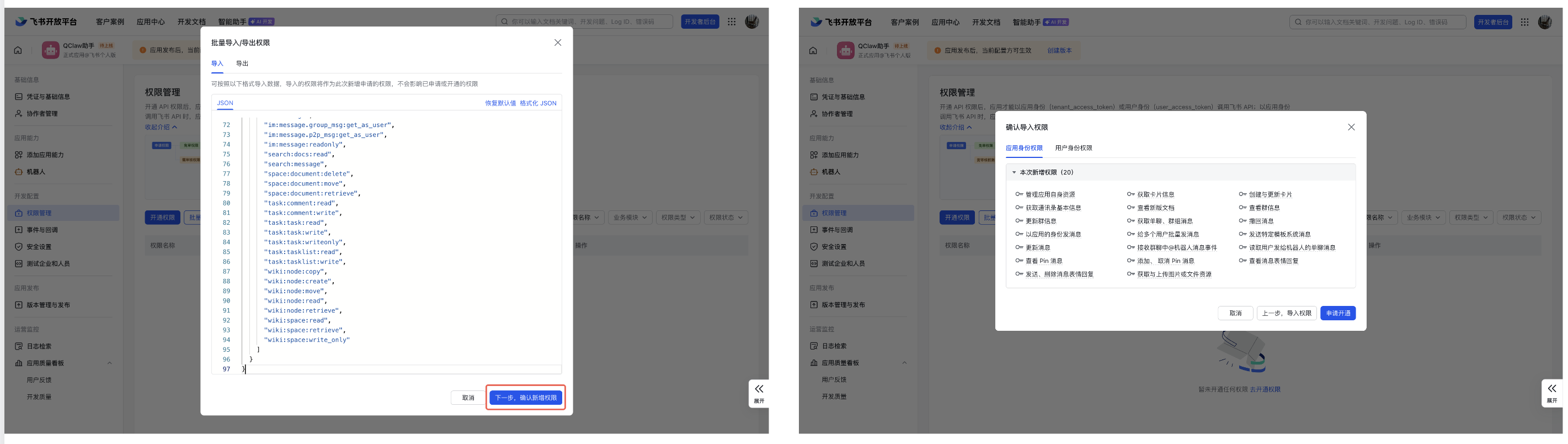 (5)在弹出的窗口中:清空输入框中的所有内容,将下方的权限列表完整复制并粘贴进去,点击「下一步,确定新增权限」及「申请开通」。