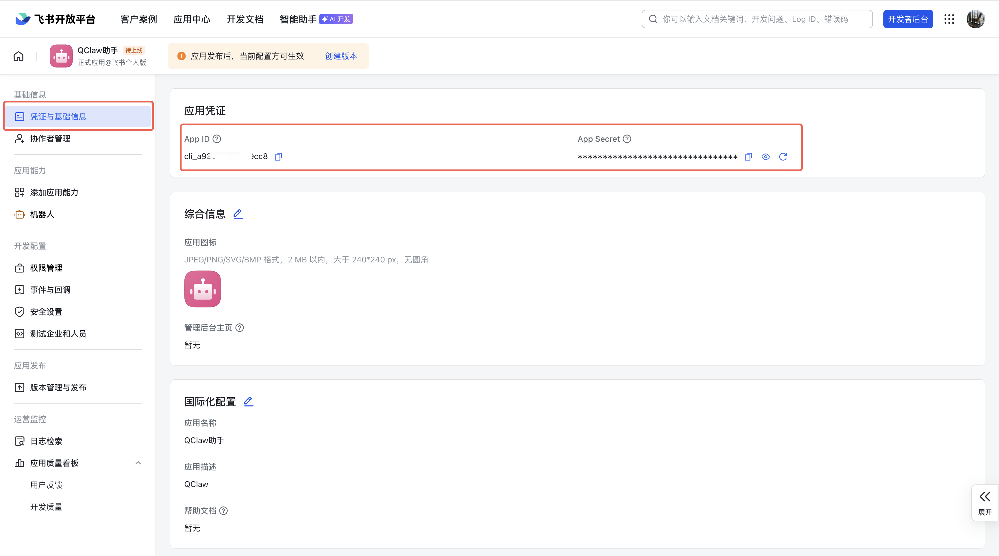 (6)在应用详情页左侧菜单中,点击「凭证与基础信息」。在页面中,即可获取App ID 和 App Secret