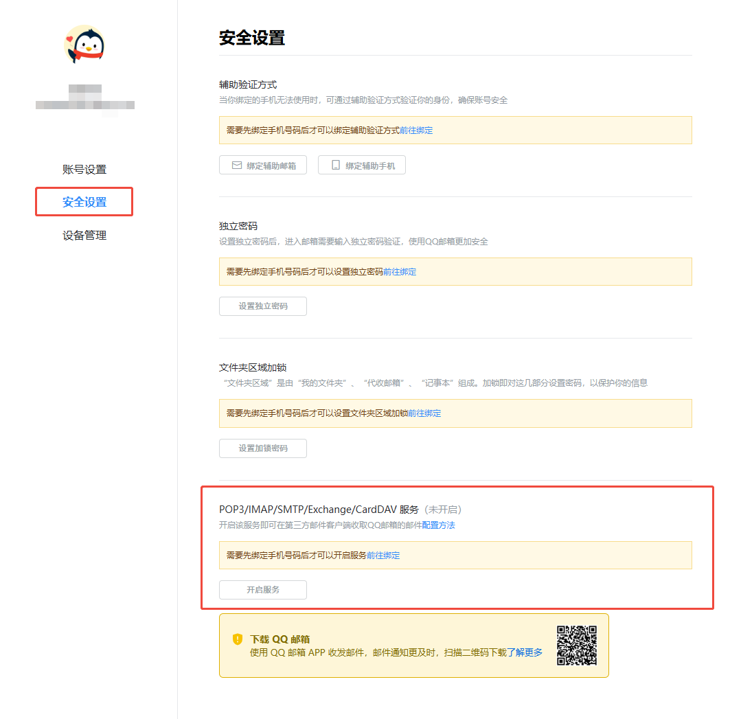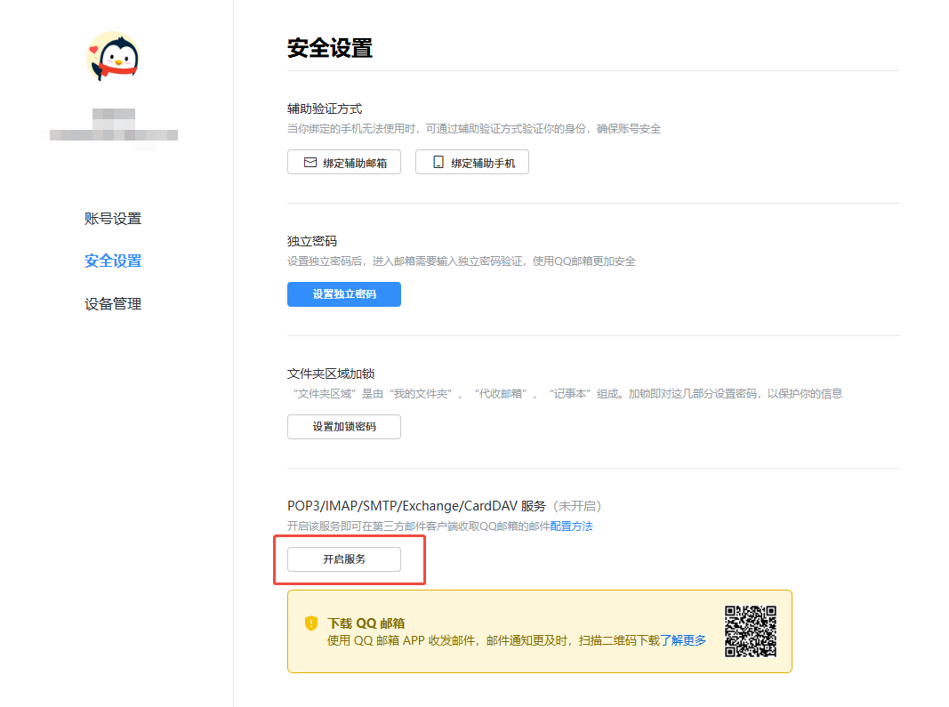 PC端登录QQ邮箱后,点击右上角头像,进入设置-账号与安全- 安全设置页面