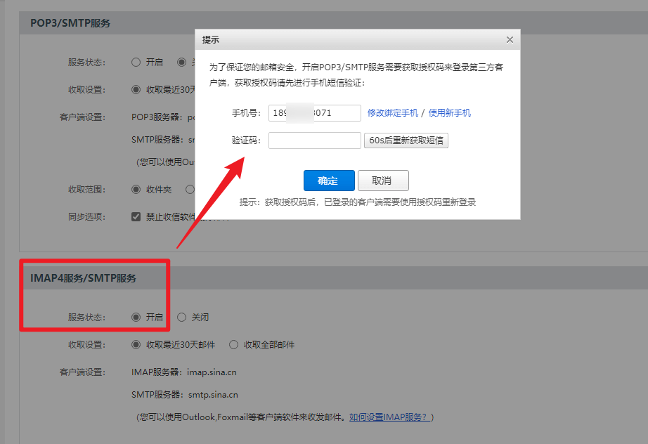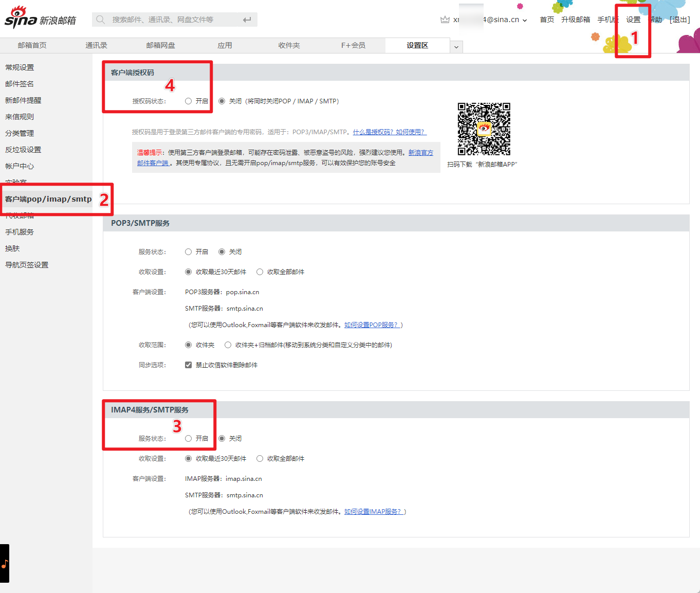 (1)右上角设置,然后进入 【客户端POP/IMAP/SMTP】 标签页,并将“IMAP4/SMTP服务”部分的 “服务状态” 设置为开启