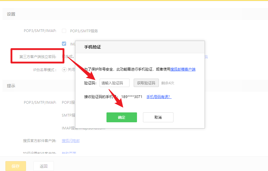 (3)启用服务后,系统会弹出一个验证窗口。点击 【获取验证码】,输入您收到的手机验证码,然后点击“确定”